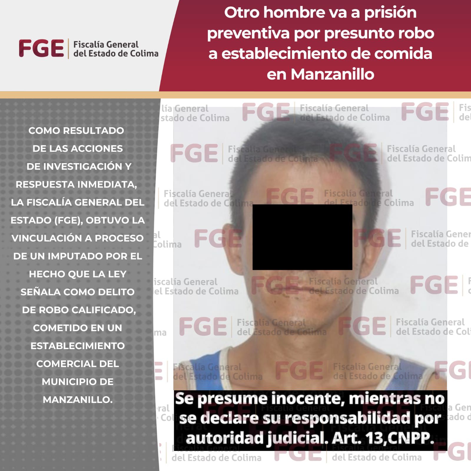 Como resultado de las acciones de investigación y respuesta inmediata, la Fiscalía General del Estado (FGE), obtuvo la vinculación a proceso de un imputado por el hecho que la ley señala como delito de robo calificado, cometido en un establecimiento comercial del municipio de Manzanillo.