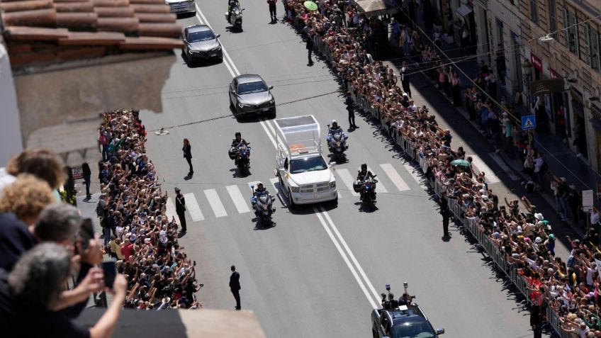 A bordo del papamóvil, el féretro del papa Francisco recorrió cuatro kilómetros por las calles de Roma, pasando frente al emblemático Coliseo y los Foros Imperiales, ante la mirada de unas 400,000 personas que acompañaron la despedida desde distintos puntos de la capital italiana, incluida la Plaza de San Pedro y sus alrededores.