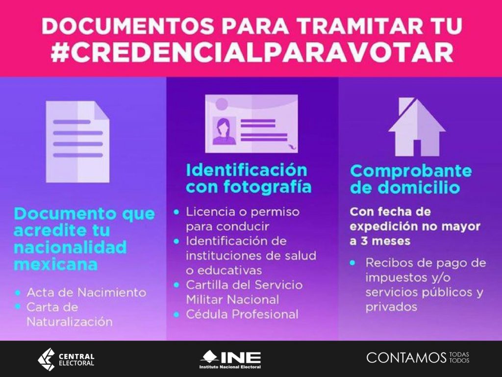 El INE señaló que los tres documentos a presentar son: el acta de nacimiento original de la o el ciudadano que va a realizar el trámite, una identificación con fotografía vigente y un comprobante de domicilio que no tenga más de tres meses de antigüedad.