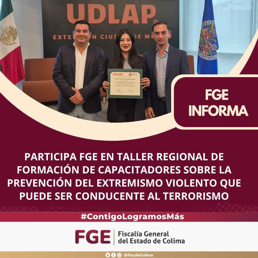 Personal de diversas áreas adscritas a la Fiscalía General del Estado (FGE), recibió la constancia de participación al “Taller Regional de Formación de Capacitadores sobre la Prevención del Extremismo Violento que puede ser Conducente al Terrorismo”; evento realizado en la Ciudad de México, en días recientes.