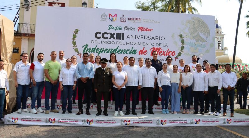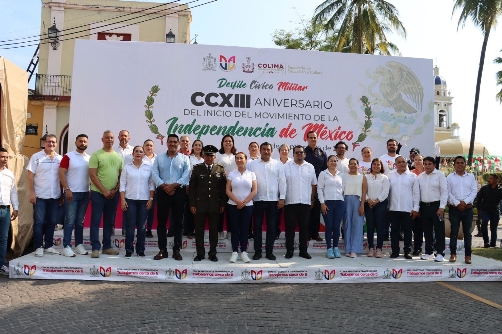 Acompañada por el Teniente Coronel Crecenciano Ventura Mendoza, representante de la 20º Zona Militar; Esteban Núñez Sánchez, representante de la Secretaría de Educación y Cultura; Adrián López, representante de la Universidad de Colima; el Diputado Héctor Magaña, y Martha Landín, representante del SNTE 6, la Alcaldesa encabezó el Desfile en el que marcharon 33 contingentes.
