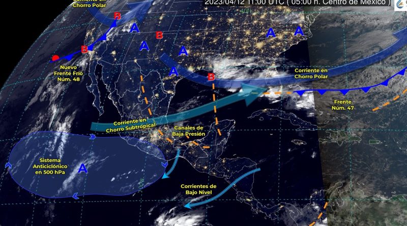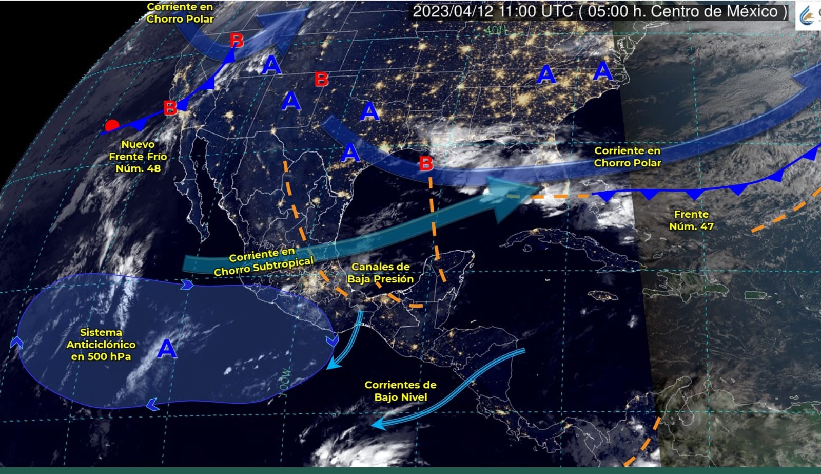 Conagua informó que el nuevo frente frío número 48 asociado con una vaguada polar ingresa al noroeste del país, originando descenso de las temperaturas diurnas y rachas de viento de 50 a 70 km/h con probables tolvaneras en la Península de Baja California, Sonora y Chihuahua.