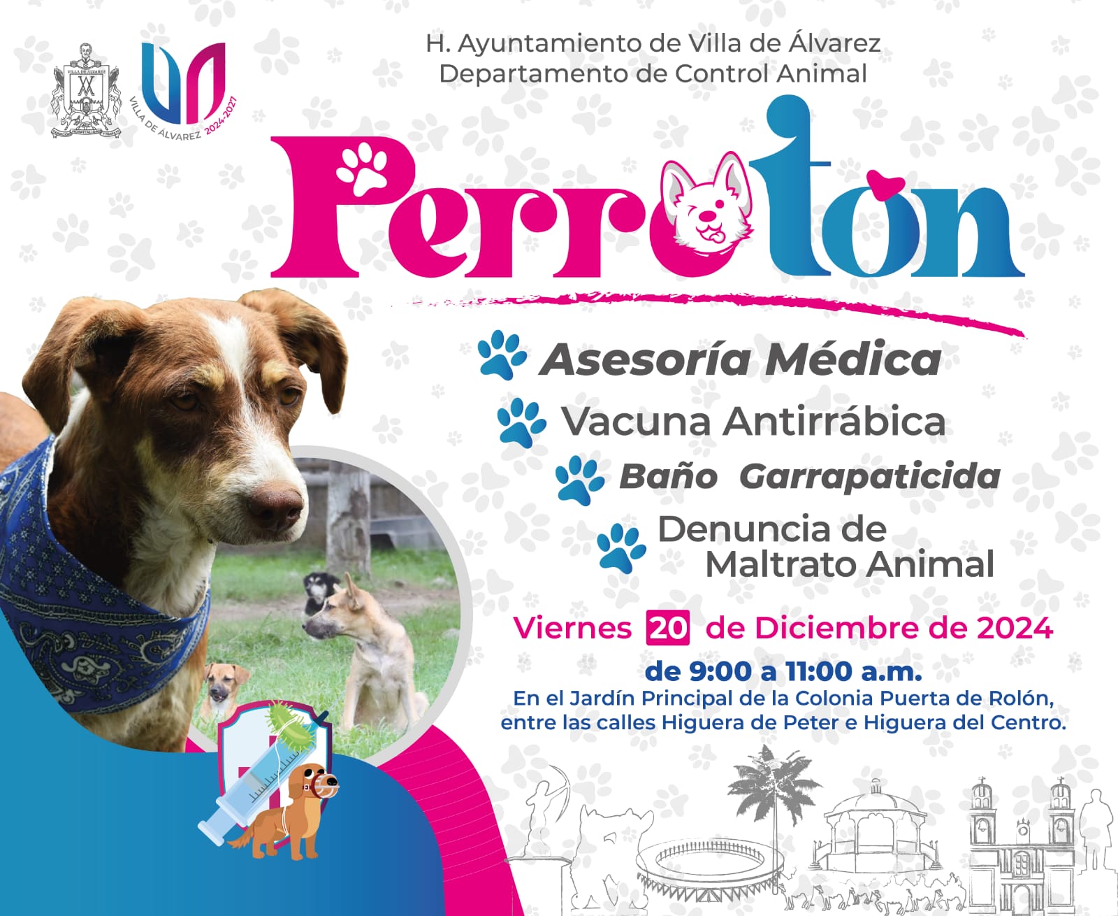Villa de Álvarez, Col.- El Gobierno Municipal de Villa de Álvarez que encabeza la Presidenta Tey Gutiérrez Andrade, llevará el programa Perrotón a la colonia Puerta de Rolón, en donde se brindarán servicios gratuitos para las mascotas.