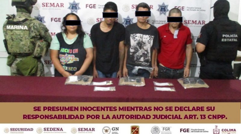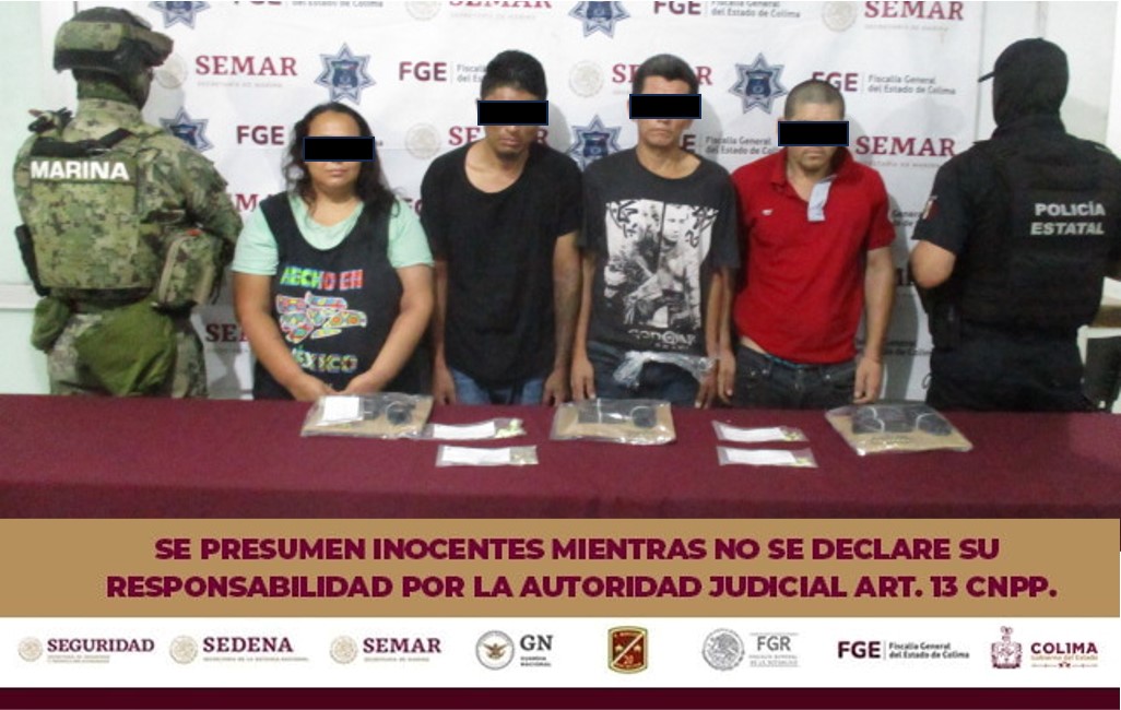 La Secretaría de Seguridad Pública (SSP) del Gobierno del Estado de Colima informa que agentes de la Policía Estatal Preventiva (PEP), en coordinación con personal de la Secretaría de Marina Armada de México (Semar), lograron la detención en flagrancia de cuatro personas, tres masculinos y una femenina, por delitos contra la salud y violación a la Ley Federal de Armas de Fuego y Explosivos, esto en el municipio de Colima.