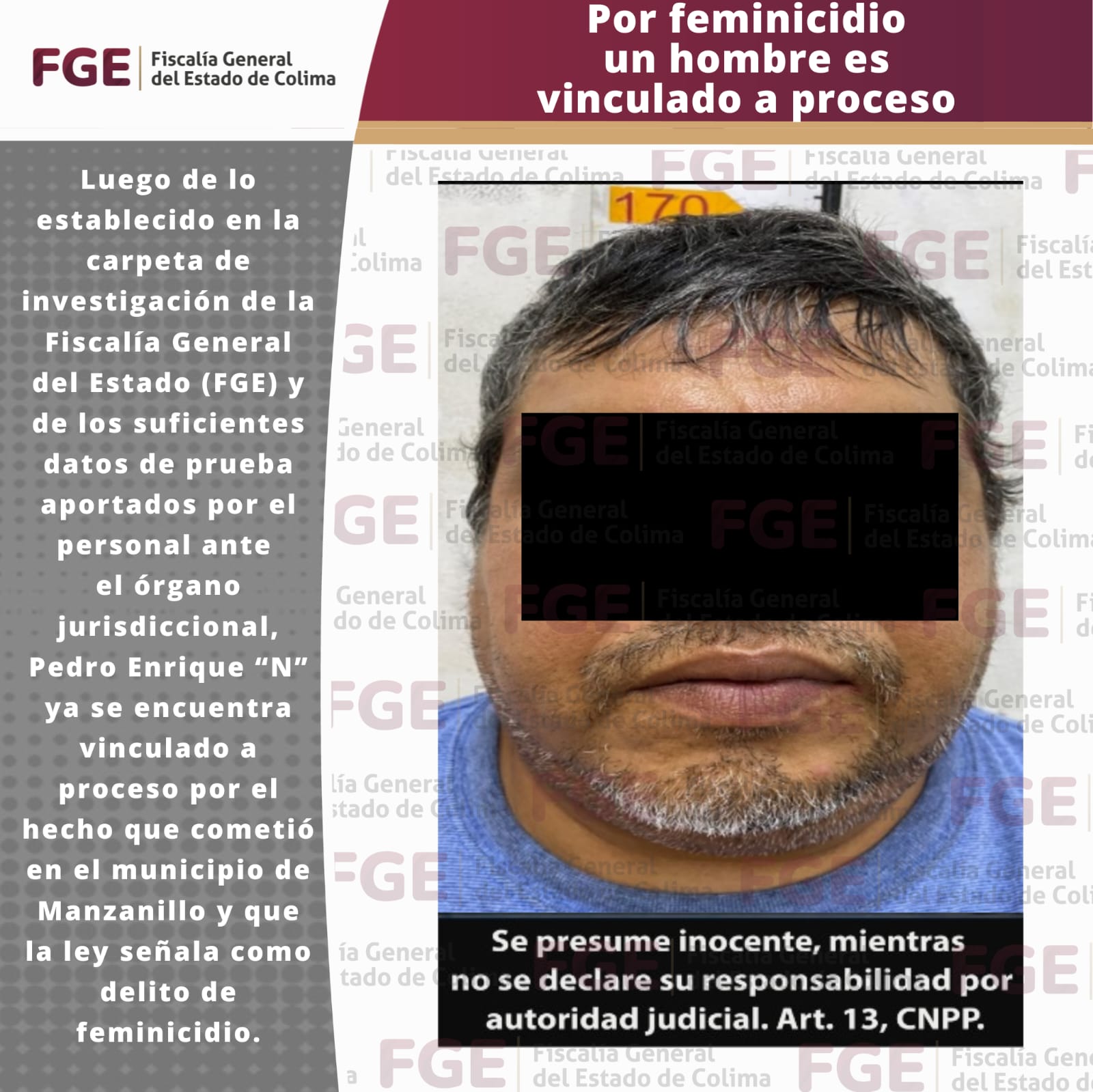 Luego de lo establecido en la carpeta de investigación de la Fiscalía General del Estado (FGE) y de los suficientes datos de prueba aportados por el personal ante el órgano jurisdiccional, Pedro Enrique “N” ya se encuentra vinculado a proceso por el hecho que cometió en el municipio de Manzanillo y que la ley señala como delito de feminicidio.