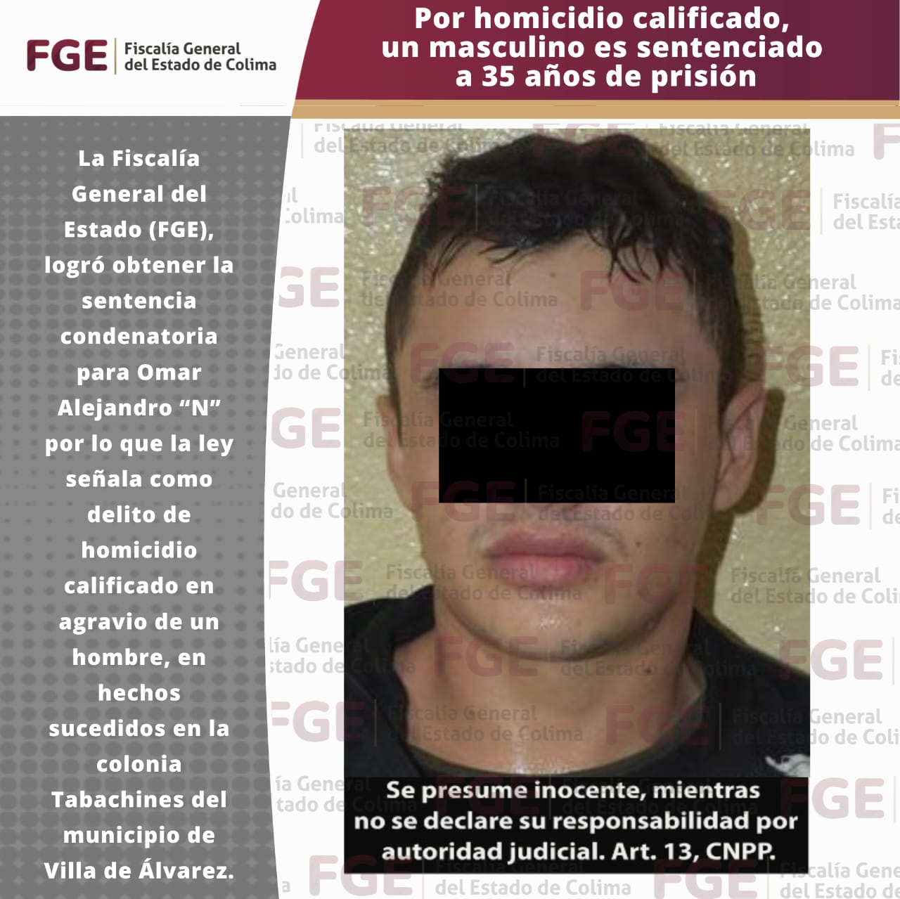 La Fiscalía General del Estado (FGE), logró obtener la sentencia condenatoria para Omar Alejandro “N” por lo que la ley señala como delito de homicidio calificado en agravio de un hombre, en hechos sucedidos en la colonia Tabachines del municipio de Villa de Álvarez.