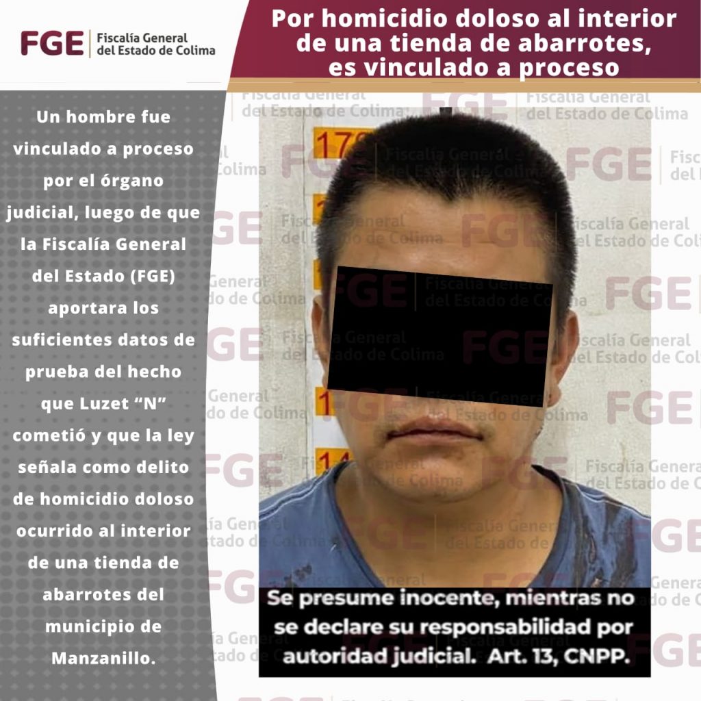 Un hombre fue vinculado a proceso por el órgano judicial, luego de que la Fiscalía General del Estado (FGE) aportara los suficientes datos de prueba del hecho que Luzet “N” cometió y que la ley señala como delito de homicidio doloso ocurrido al interior de una tienda de abarrotes del municipio de Manzanillo.