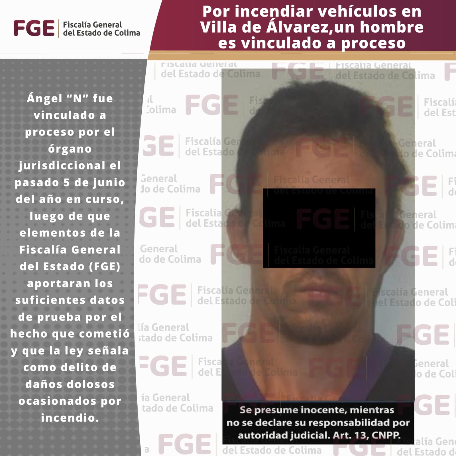 Ángel “N” fue vinculado a proceso por el órgano jurisdiccional el pasado 5 de junio del año en curso, luego de que elementos de la Fiscalía General del Estado (FGE) aportaran los suficientes datos de prueba por el hecho que cometió y que la ley señala como delito de daños dolosos ocasionados por incendio.