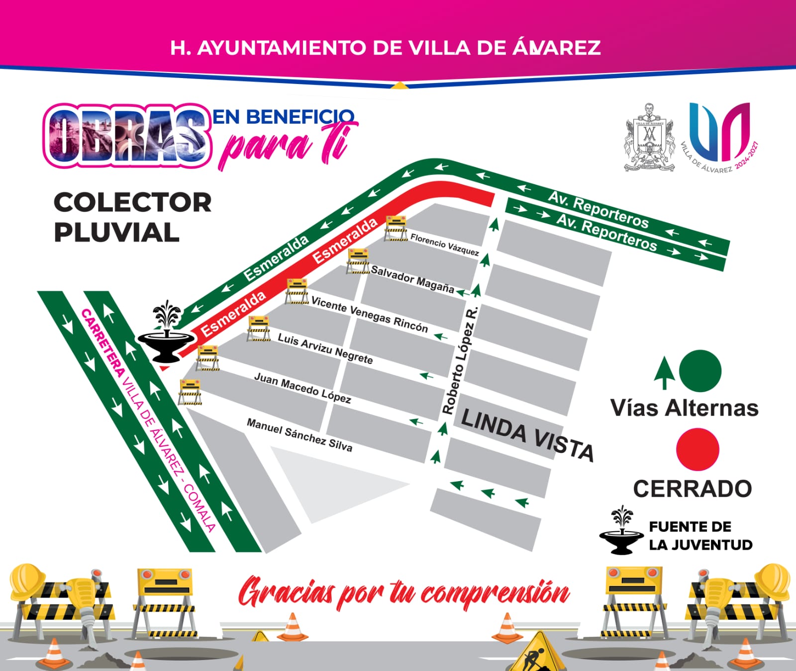 Villa de Álvarez, Col.- Por las obras de construcción de la primera etapa del colector pluvial en la colonia Lindavista II, la avenida Esmeralda, en el municipio de Villa de Álvarez, estará cerrada a la circulación vial.