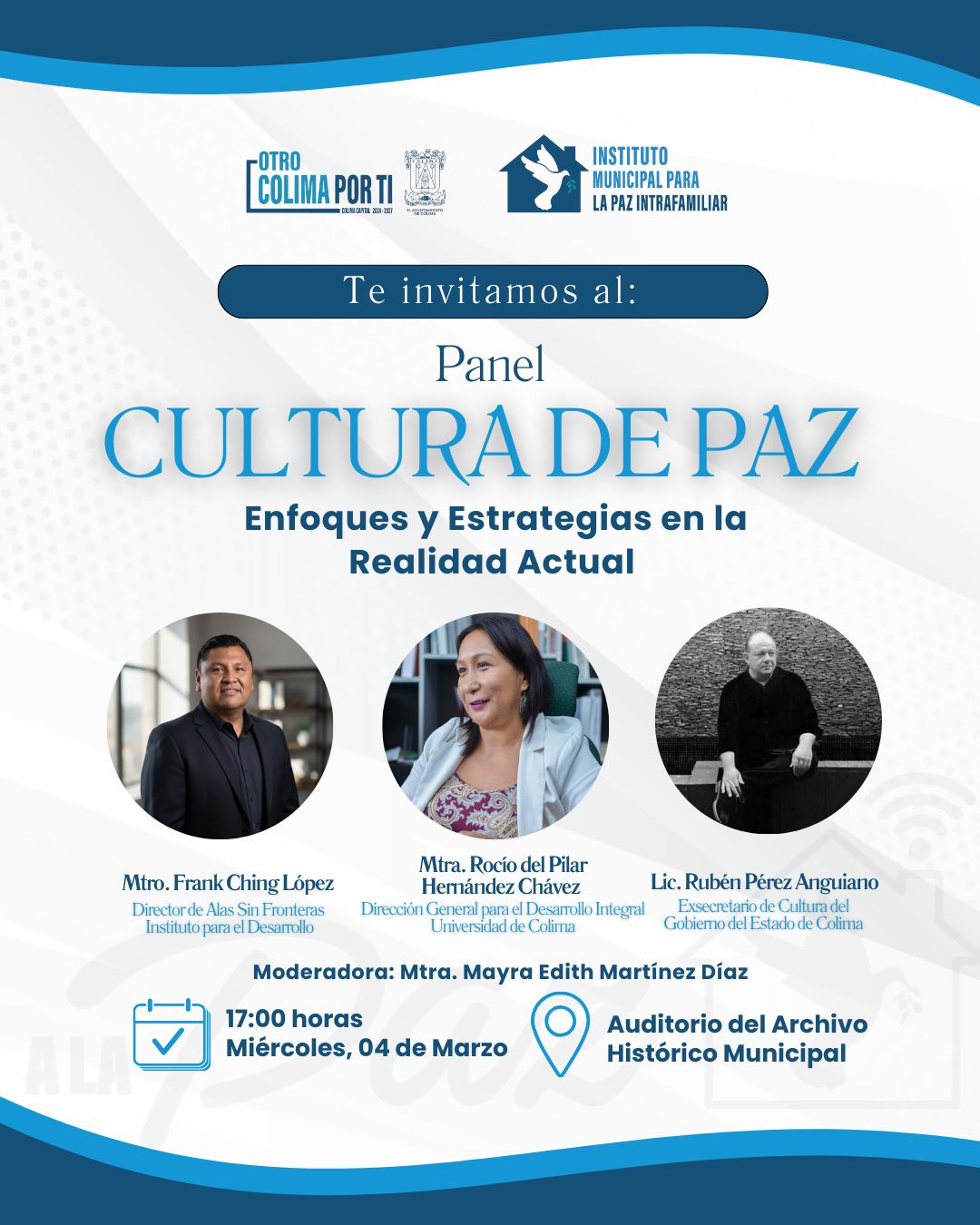 El Panel Cultura de Paz, se realizará este miércoles 04 de marzo, a las 17:00 horas, en las instalaciones del Auditorio del Archivo Histórico del Municipio de Colima.