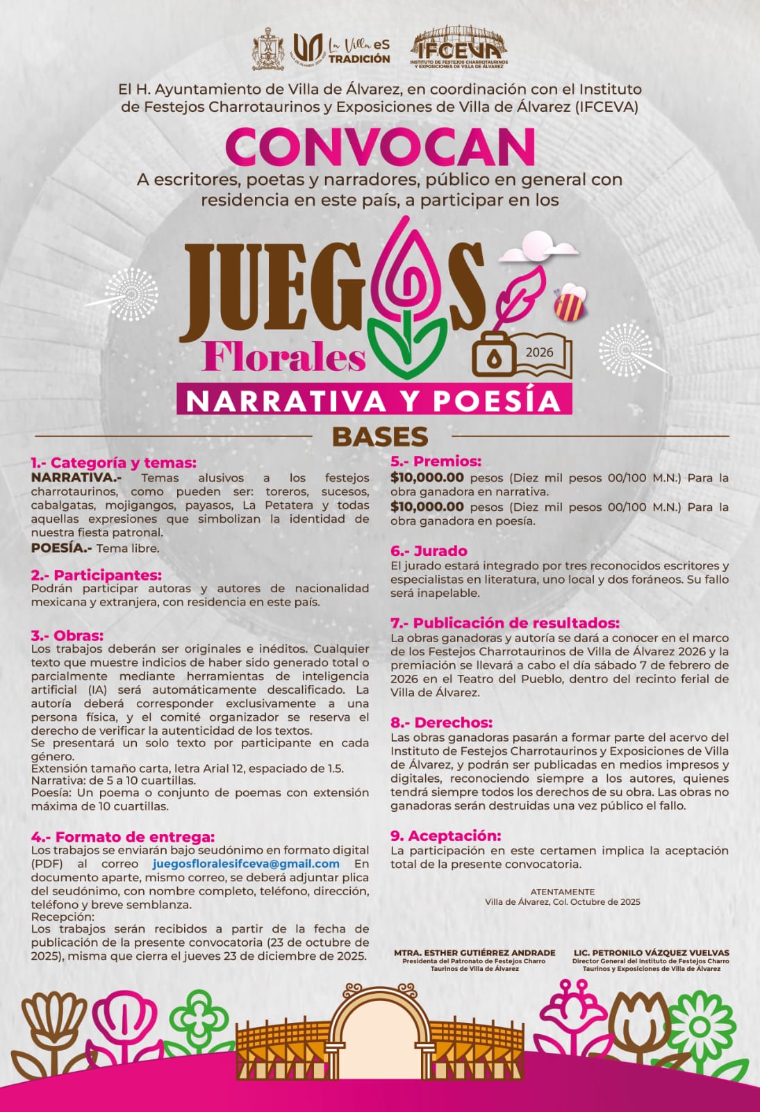 Villa de Álvarez, Col.- La Presidenta Tey Gutiérrez Andrade presentó la Convocatoria de los Juegos Florales Narrativa y Poesía 2026, que en el marco de la edición 169 de los Festejos Charro Taurinos de Villa de Álvarez invita a participar a personas escritoras, narradoras, poetas y público en general.
