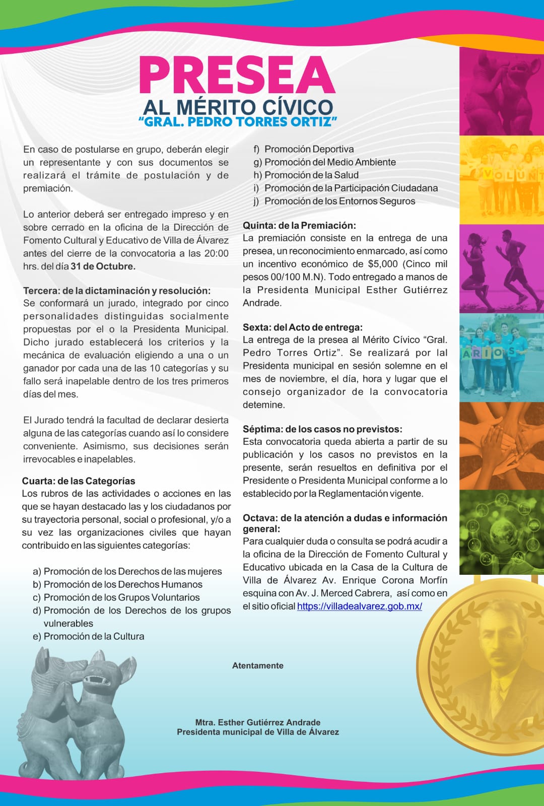 La Presea al Mérito Cívico “General Pedro Torres Ortiz” reconocerá la trayectoria personal, social de individuos u organizaciones civiles de Villa de Álvarez que hayan contribuido en la Promoción de los Derechos de las Mujeres, los Derechos Humanos, los Grupos Voluntarios, los Derechos de los grupos vulnerables, la Cultura, el Deporte, el Medio Ambiente, la Salud, la Participación Ciudadana y los Entornos Seguros.