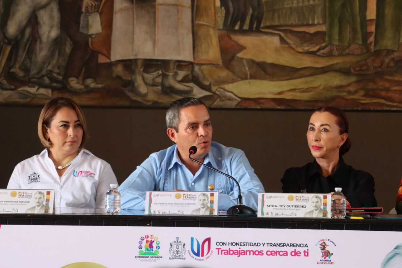 Villa de Álvarez, Col.- La Presidenta Tey Gutiérrez Andrade, y el Rector de la Universidad de Colima, Christian Torres Ortiz Zermeño, presentaron la Convocatoria a la Presea al Mérito Cívico “General Pedro Torres Ortiz”, con la que el Ayuntamiento de Villa de Álvarez visibilizará y reconocerá el esfuerzo de las y los villalvarenses destacados en diferentes ámbitos de las humanidades.