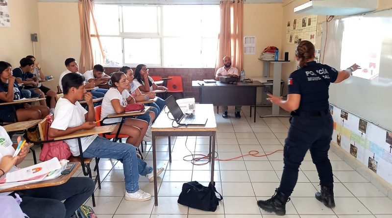 El Ayuntamiento de Manzanillo a través del personal de la Dirección de Prevención Social del Delito de Seguridad Pública, llevó a cabo la charla preventiva del programa P.P.D (Policías previniendo el delito) y el programa D.A.R.E (Educación para resistir el abuso de drogas y violencia) en el Telebachillerato comunitario del Llano de La Marina turno vespertino. Por instrucciones de la presidenta municipal Griselda Martínez, se llevó a cabo esta jornada de acercamiento con los jóvenes para que puedan evitar acciones dañinas, impartiéndoles temas de alerta: