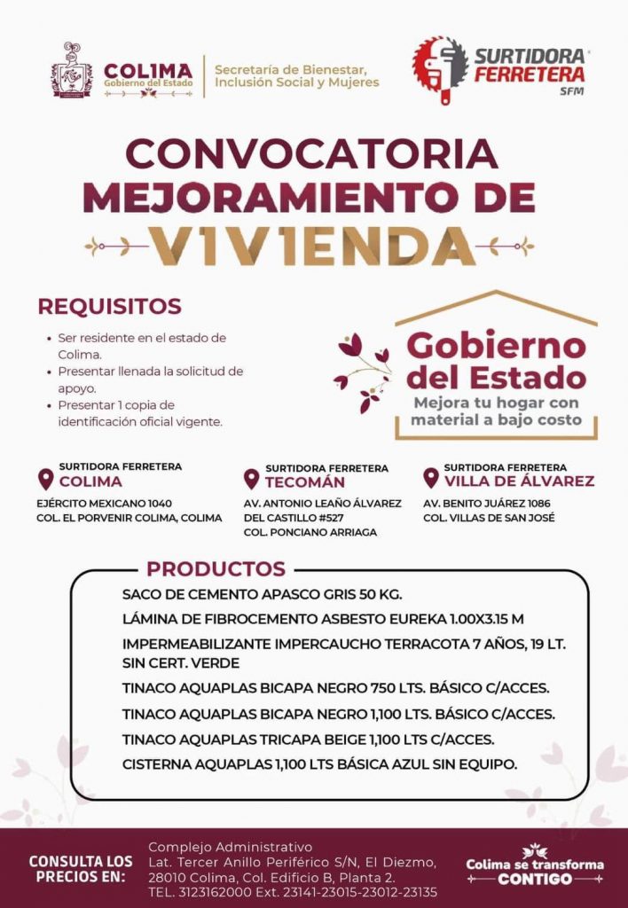 La convocatoria cierra el próximo 31 de agosto y beneficia a residentes del estado mayores de edad que necesiten material para construcción a bajo costo, y las solicitudes se reciben en las oficinas de la Sebiinsom en Colima y Tecomán, así como en los Diálogos Comunitarios que encabeza la gobernadora Indira Vizcaíno Silva en las colonias y localidades rurales del estado, donde se les llena un formato foliado que presentan directamente en tres sucursales de Surtidora Ferretera (Colima, Tecomán y Manzanillo).