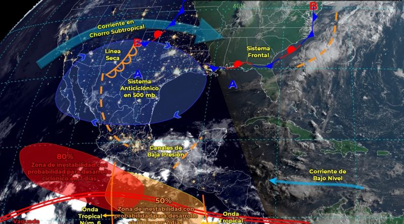 Conagua informa que la zona de baja presión al sur de las costas de Guerrero disminuye a 20% su probabilidad de desarrollo ciclónico en 48 horas y a 80% en siete días; se localiza aproximadamente a 720 kilómetros al sur-suroeste de Acapulco y se desplaza al oeste-noroeste. Por otro lado, se prevé la formación de otra zona de baja presión al sur de las costas de Chiapas y Oaxaca, que mantiene 50% su probabilidad para desarrollo ciclónico en siete días.