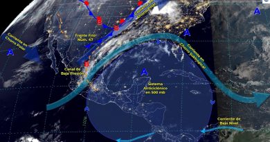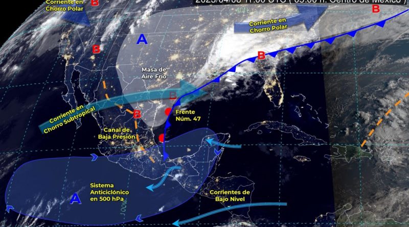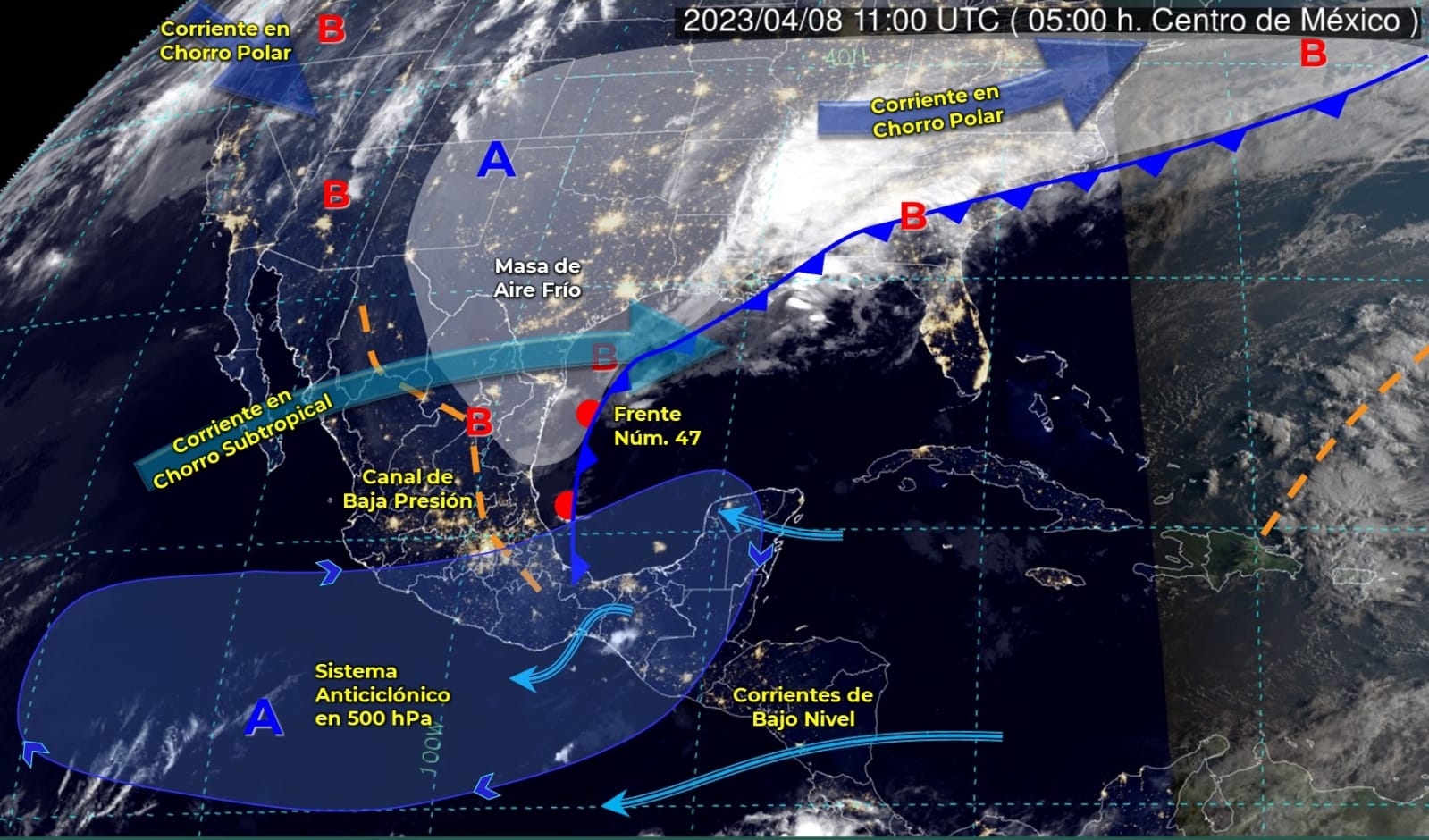 En contraste, las temperaturas mínimas para hoy en la República Mexicana descenderían de -10 a -5°C con heladas en zonas montañosas de Durango; de -5 a 0°C en regiones de Chihuahua; así como de 0 a 5°C en áreas del Estado de México, Baja California, Sonora, Coahuila, Nuevo León, Zacatecas, Jalisco, Guanajuato y Michoacán.