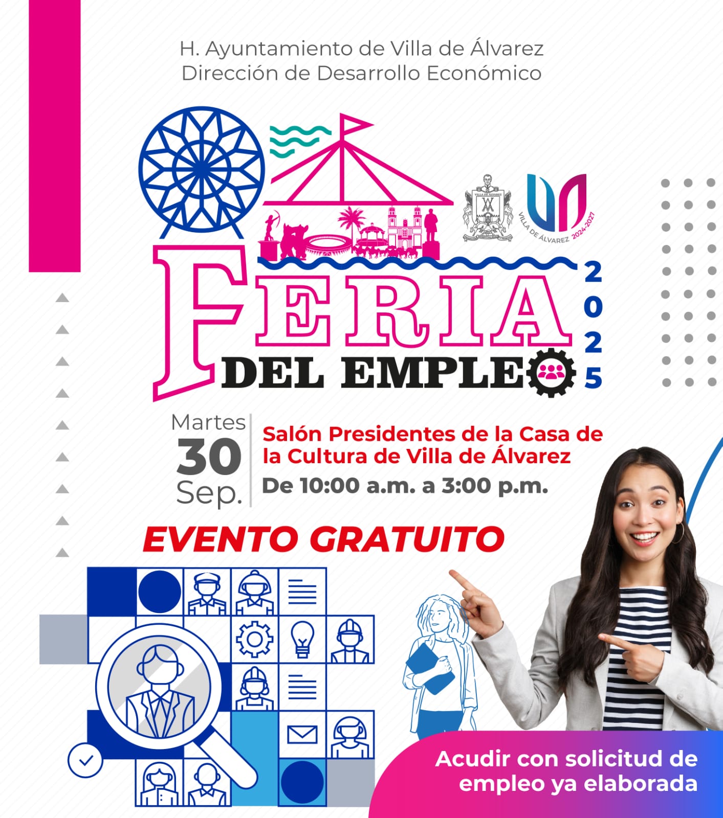 Villa de Álvarez, Col.- Más de 24 empresas de diversos giros ofrecerán 297 oportunidades laborales en la Feria del Empleo, que el martes 30 de septiembre se realizará en el Salón Presidentes de la Casa de la Cultura de Villa de Álvarez.