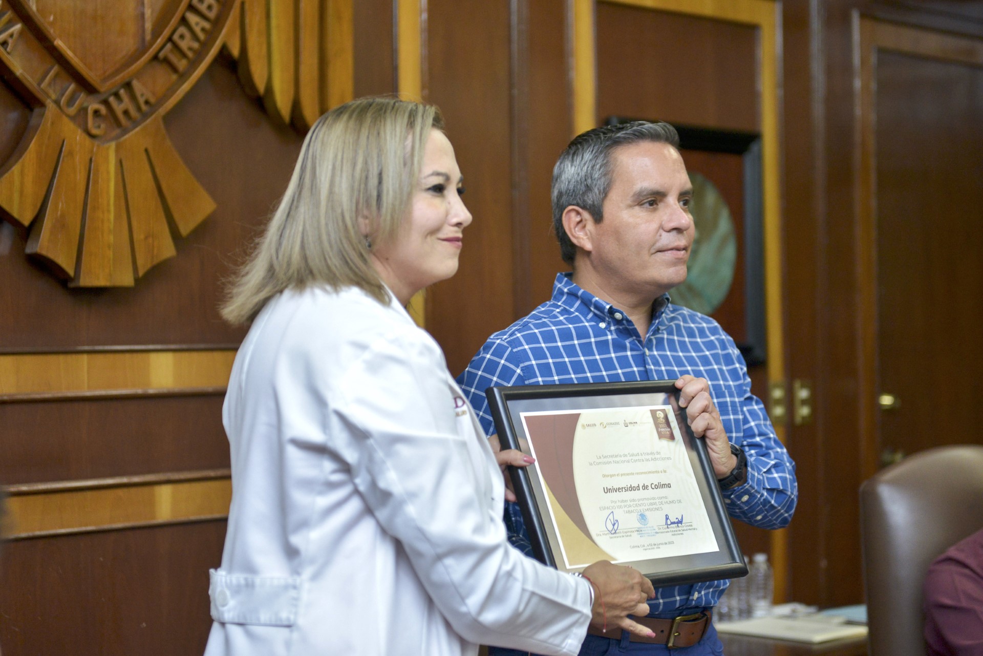 En acto realizado este viernes en la sala de juntas de rectoría, Martha Janeth Espinosa Mejía, secretaria de Salud del Gobierno del Estado de Colima, entregó un reconocimiento a la Universidad de Colima por acreditar los espacios del campus central como libres de humo de tabaco y seis certificados a representantes de la comunidad universitaria que han estado trabajado para dar cumplimiento a la Ley General de Control de Tabaco y atender la actualización al reglamento de dicha ley, que entró en vigor el 15 de enero de este 2023.
