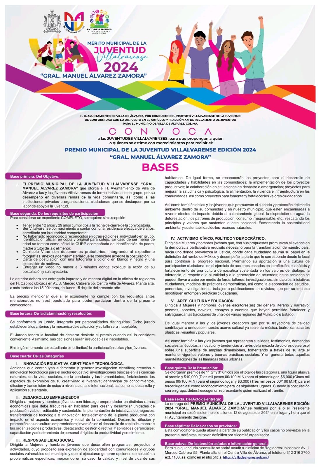 La convocatoria para entregar el Premio al Mérito Municipal de la Juventud Villalvarense “Gral. Manuel Álvarez Zamora”, está disponibles para su consulta en la página web www.villadealvarez.gob.mx y en la página de Facebook del Ayuntamiento de Villa de Álvarez.