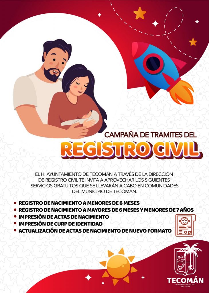 El H. Ayuntamiento de Tecomán, encabezado por el alcalde Elías Antonio Lozano Ochoa, te invita a participar en la “Campaña de Trámites del Registro Civil 2023”, ofrecido por el Registro Civil de Tecomán, que tiene como objetivo disminuir el rezago de registros de nacimiento en la población de menores en Tecomán ya que se estarán visitando diferentes comunidades rurales del municipio.
