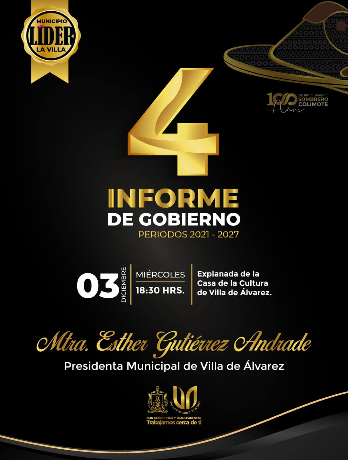 Villa de Álvarez, Col.- La Presidenta Municipal Tey Gutiérrez Andrade ofrecerá su Cuarto Informe de Gobierno este miércoles 03 de diciembre a partir de la 6:30 de la tarde en la Explanada de la Casa de la Cultura de Villa de Álvarez, donde compartirá a la población los resultados, avances y acciones realizadas durante el año 2025.