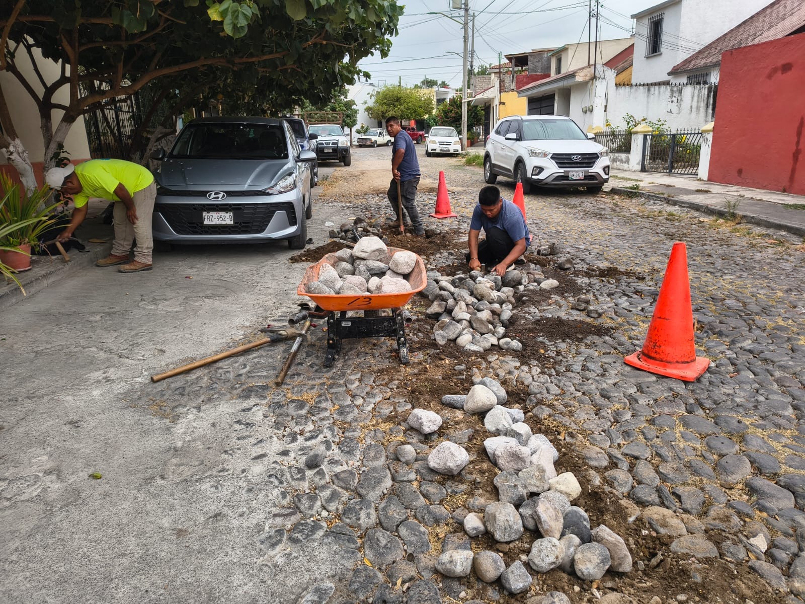 Villa de Álvarez, Col.- El Gobierno Municipal de Villa de Álvarez continúa realizando trabajos de bacheo en calles empedradas, mejorando son ello la seguridad vial al interior de las colonias, así lo manifestó la Presidenta Tey Gutiérrez Andrade.