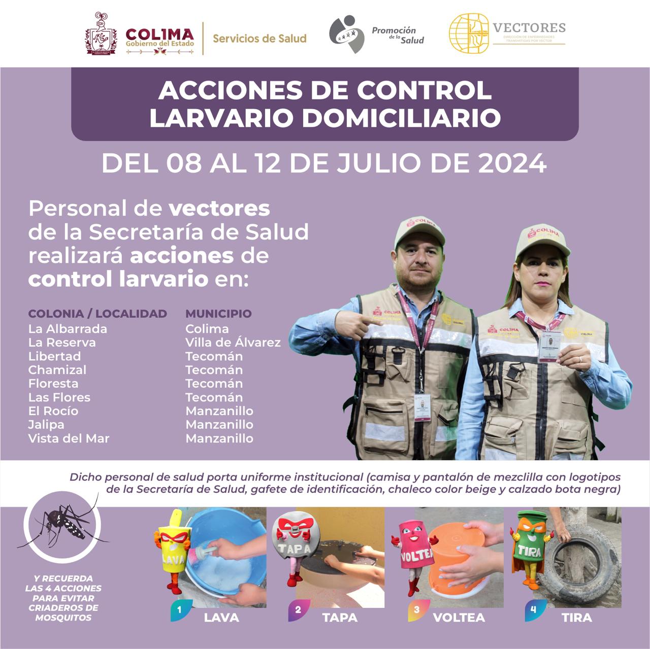 Como parte del reforzamiento a las acciones de combate al dengue, zika y chikungunya para proteger la salud de la población, personal de Vectores de la Secretaría de Salud del Gobierno del Estado de Colima continuará realizando del lunes 8 al viernes 12 de julio acciones de control larvario en viviendas con casos probables de dengue de 9 colonias de cuatro municipios de la entidad.