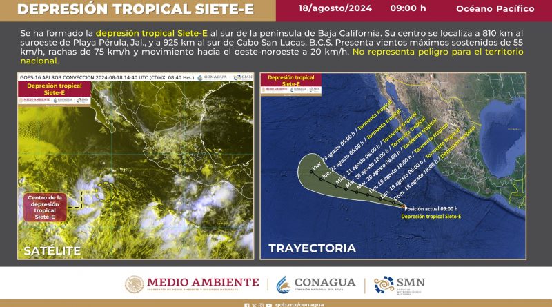 En el transcurso de la mañana de este domingo 18 de agosto se ha formado la Depresión Tropical «Siete-E» al suroeste de Playa Pérula en el estado de Jalisco y al sur de Cabo San Lucas perteneciente al estado de Baja California Sur. Así lo dio a conocer el Servicio Meteorológico Nacional (SMN), organismo que destacó que hasta el momento dicho sistema no tiene efectos en la República Mexicana.