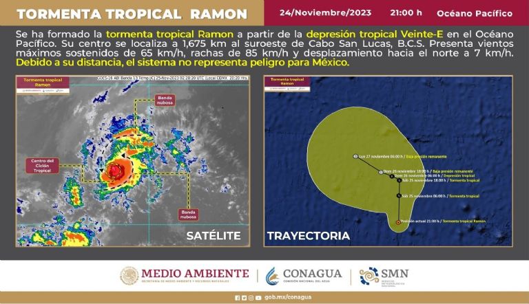 El Servicio Meteorológico Nacional (SMN) de la Comisión Nacional del Agua (Conagua), dio a conocer a través de un comunicado en su página oficial que a partir de la depresión tropical Veinte-E, se formó la Tormenta Tropical «Ramón» en el Océano Pacífico, al suroeste de Cabo San Lucas.