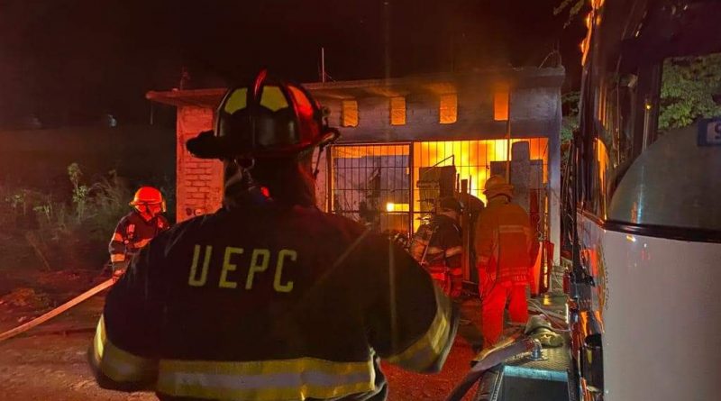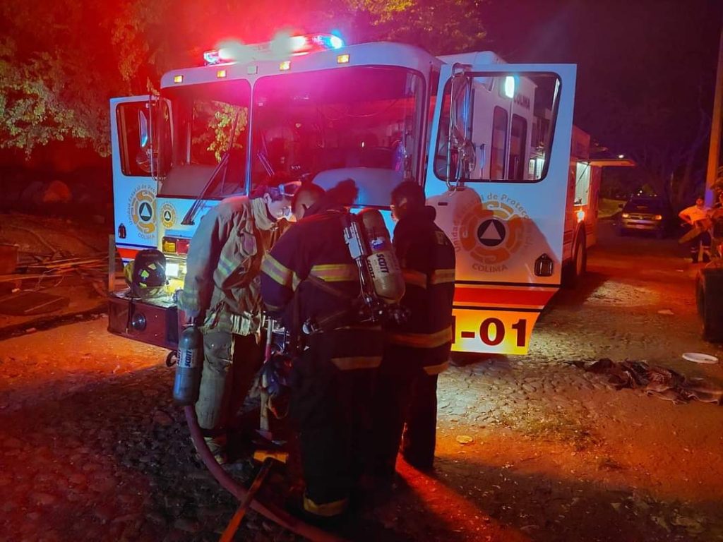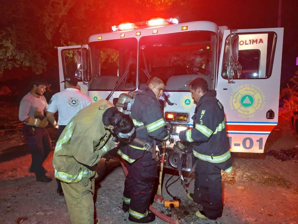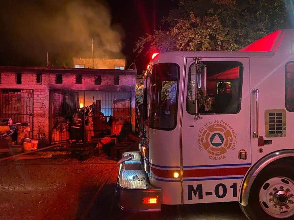 Oficiales de la Unidad Estatal de Protección Civil realizan maniobras la noche de este Jueves para sofocar el incendio en una carpintería ubicada en la colonia Salomón Preciado, en el municipio de Villa de Álvarez.