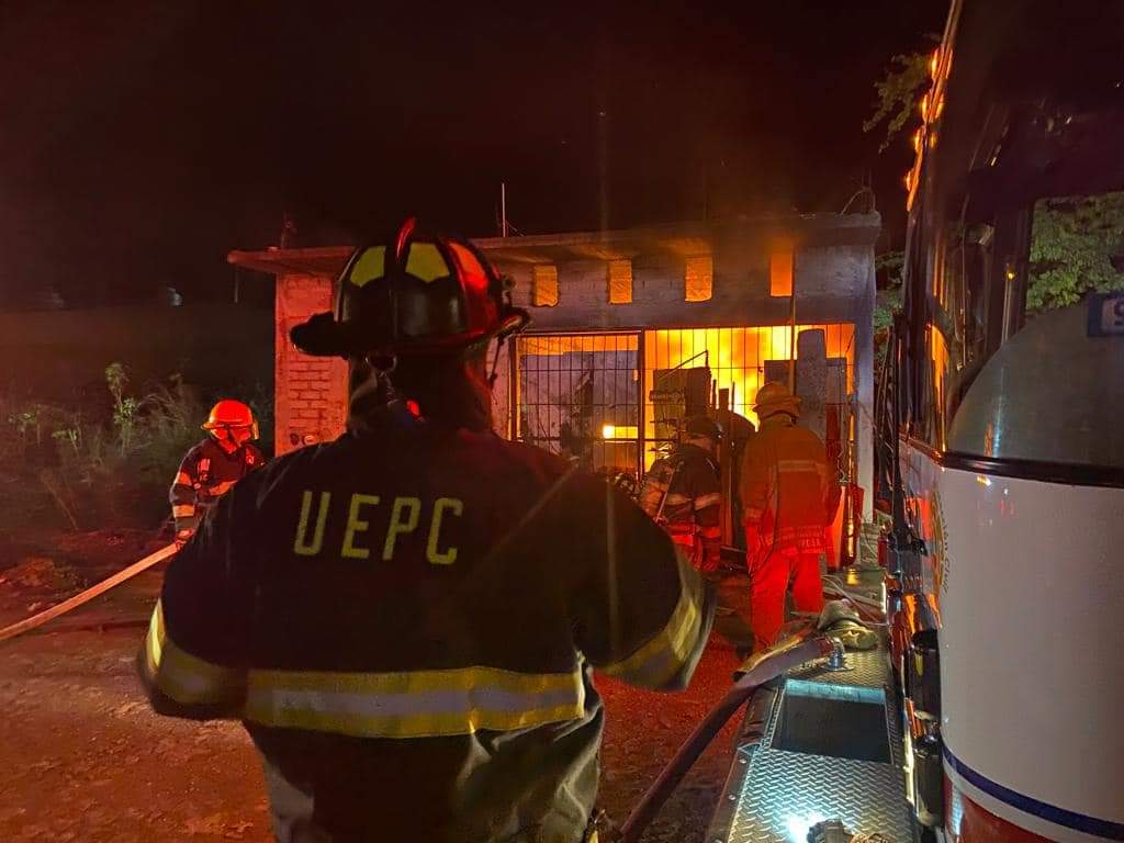 Oficiales de la Unidad Estatal de Protección Civil realizan maniobras la noche de este Jueves para sofocar el incendio en una carpintería ubicada en la colonia Salomón Preciado, en el municipio de Villa de Álvarez.