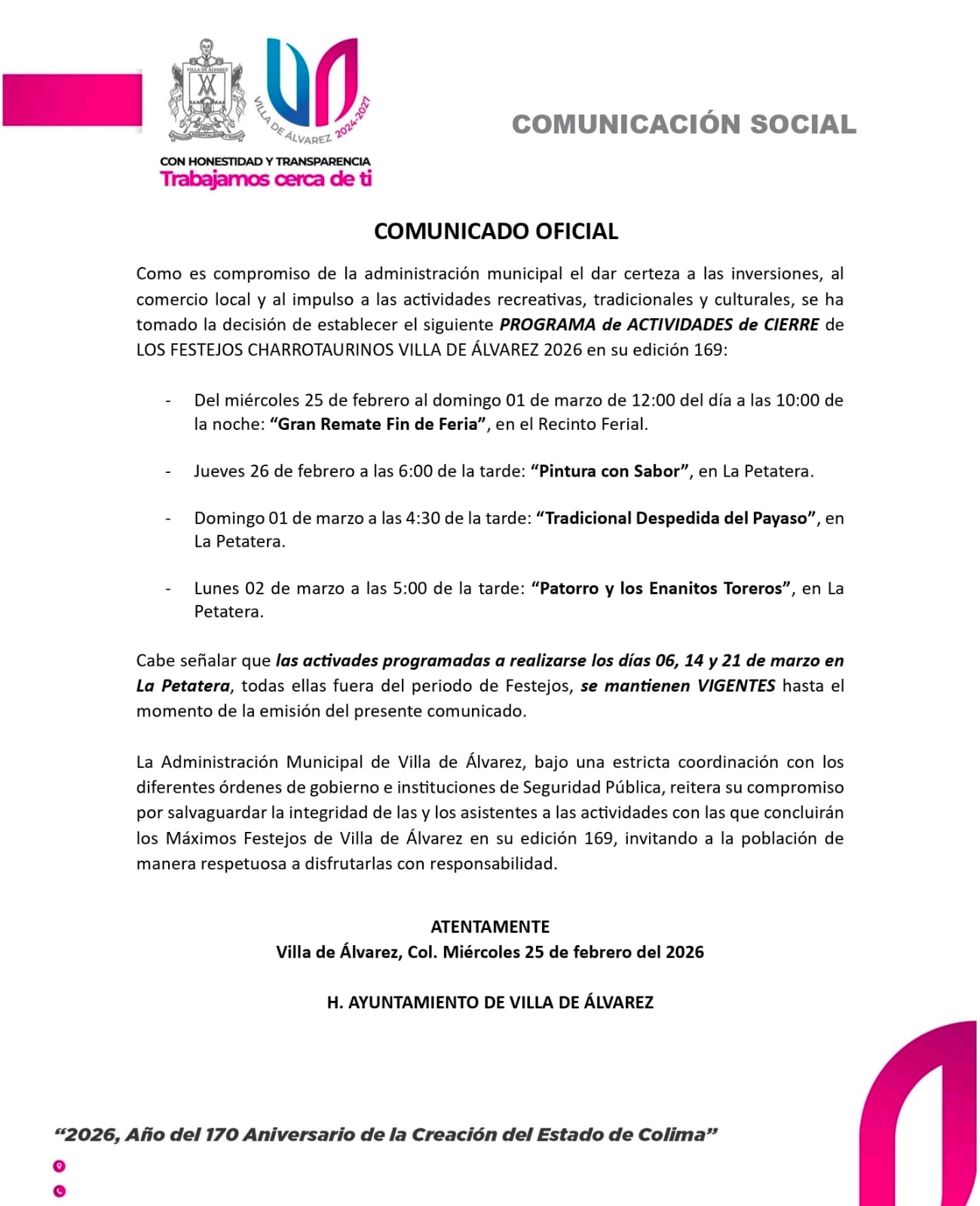 Como es compromiso de la Administración Municipal el dar certeza a las inversiones, al comercio local y al impulso a las actividades recreativas, tradicionales y culturales, se ha tomado la decisión de establecer el siguiente PROGRAMA de ACTIVIDADES de CIERRE de LOS FESTEJOS CHARROTAURINOS VILLA DE ÁLVAREZ 2026 en su edición 169: