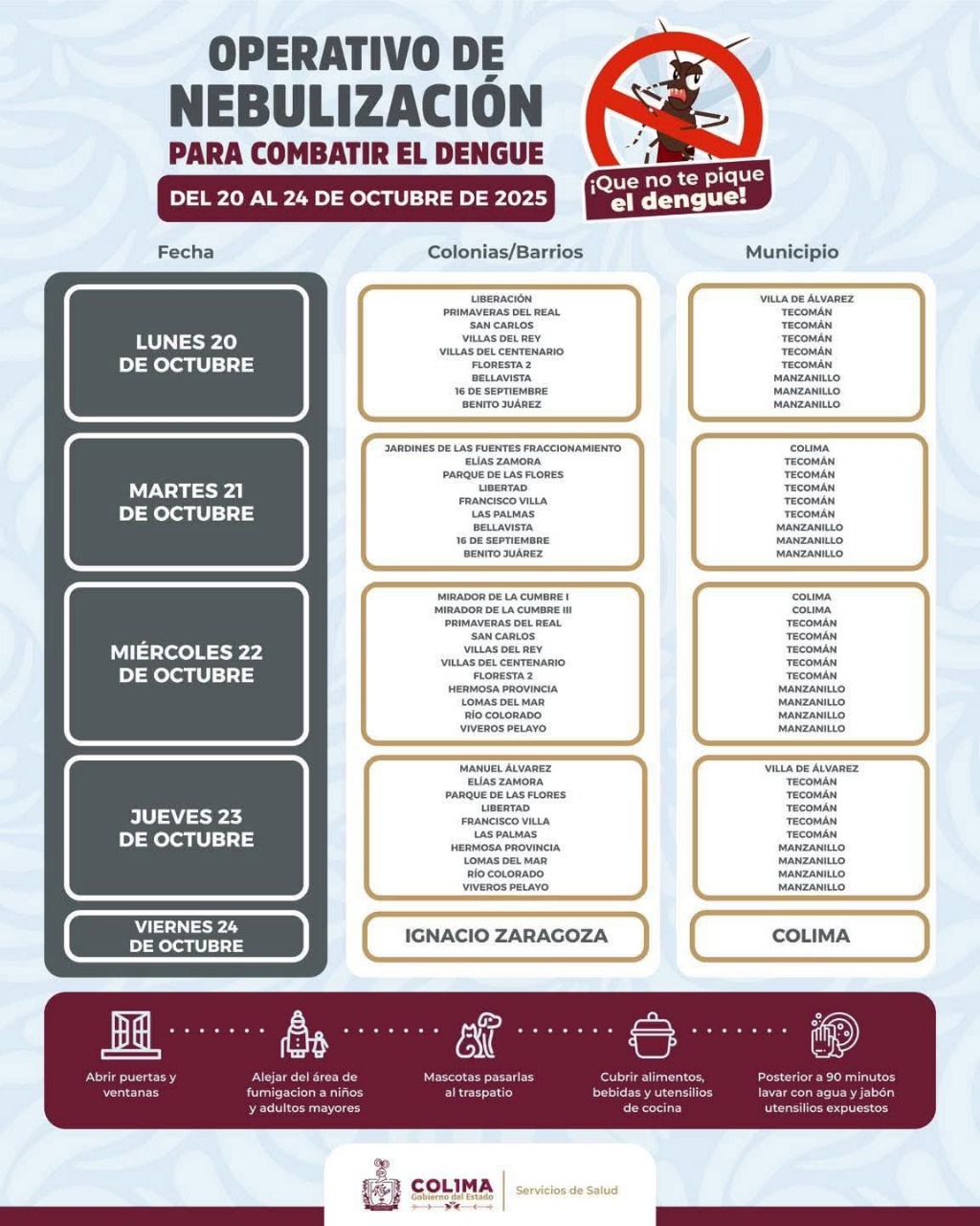 Para el jueves nebulizará la colonia Manuel Álvarez (Villa de Álvarez), las mismas cinco colonias de Tecomán que fumigará el martes, así como las mismas colonias y fraccionamientos de Manzanillo que nebulizará el miércoles. Y el viernes 24 de octubre fumigará en la colonia Ignacio Zaragoza, de Colima.