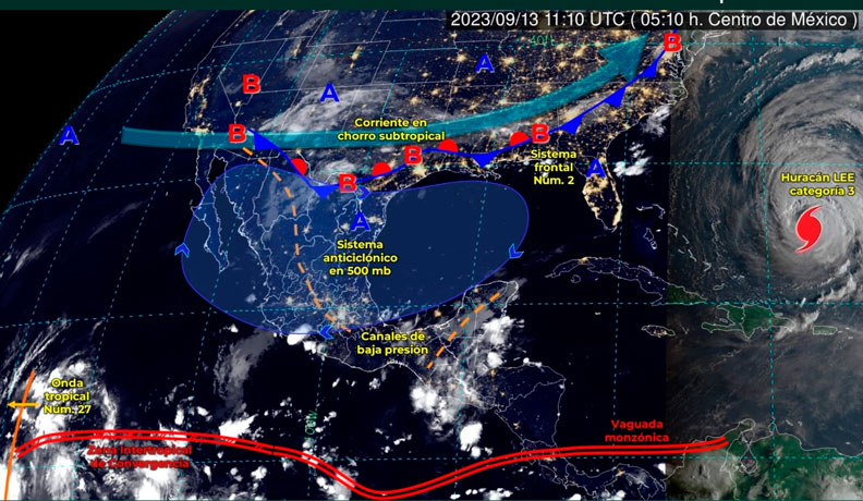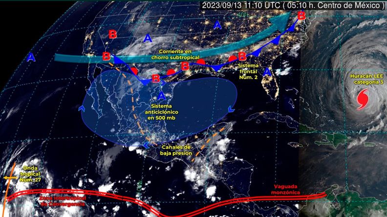 Hoy miércoles 13 de septiembre, canales de baja presión podrían ocasionar lluvias con chubascos en el oriente de la Península de Yucatán, centro de México y occidente del país, incluido el estado de Colima.