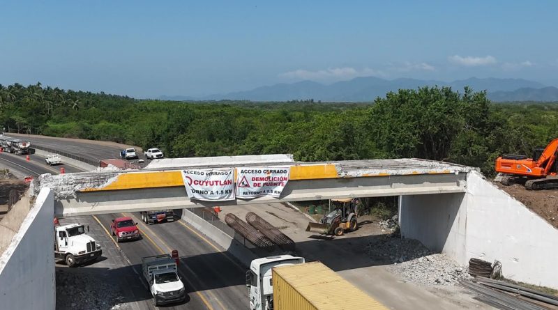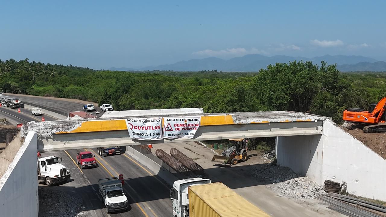 La Secretaría de Infraestructura, Desarrollo Urbano y Movilidad (Seidum) del Gobierno del Estado de Colima informa que este viernes 7 de noviembre se llevará a cabo el retiro de las trabes del puente Cuyutlán, en la autopista Colima-Manzanillo, como parte de los trabajos de rehabilitación y modernización de esta importante infraestructura; a las 3:00 de la tarde inician los trabajos preliminares, por lo que se hace un llamado a extremar precauciones, respetar los límites de velocidad y atender indicaciones del personal en la zona, para evitar algún percance.