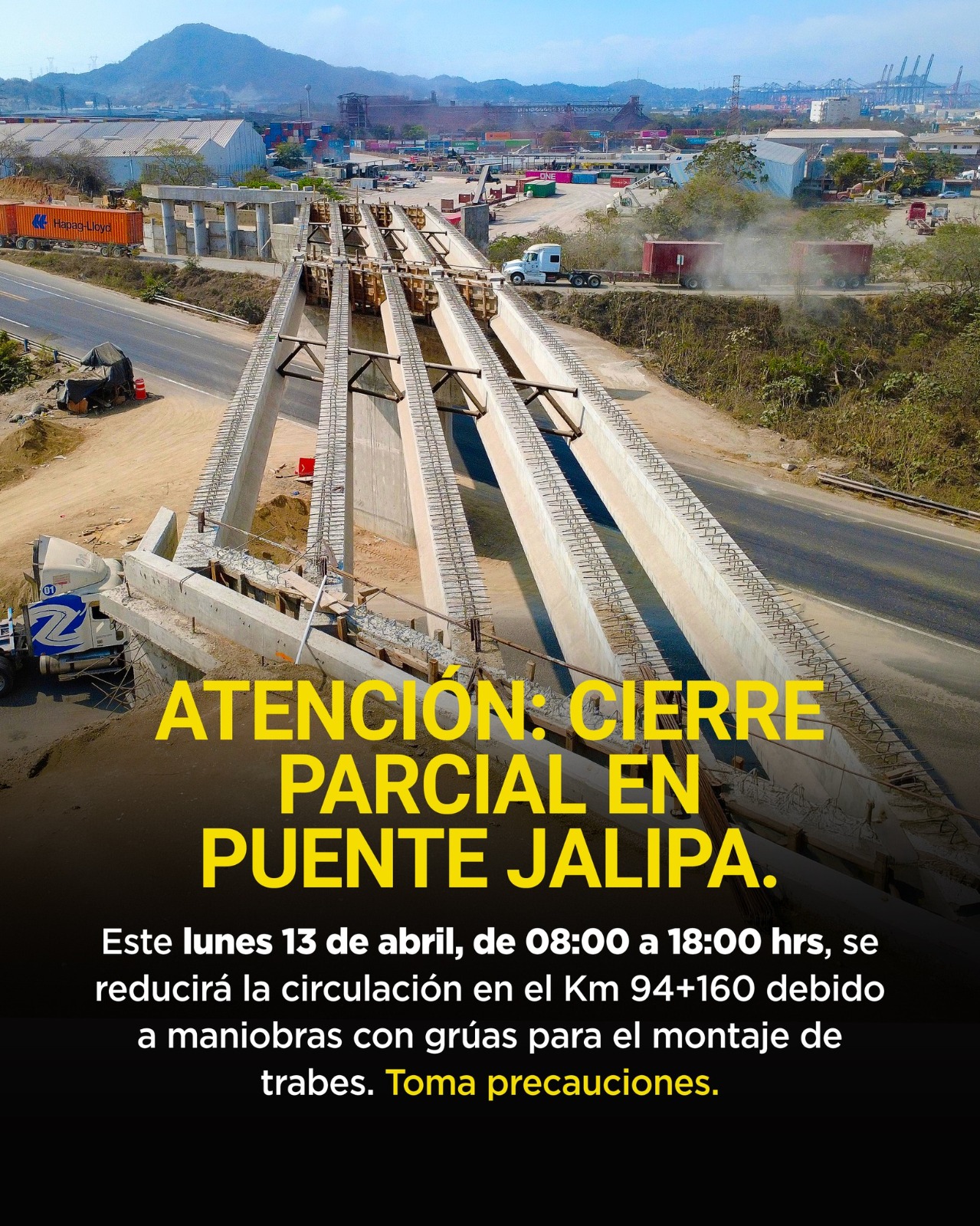El Gobierno del Estado de Colima, a través de la Secretaría de Infraestructura, Desarrollo Urbano y Movilidad (Seidum), informa que este lunes 13 de abril de 8:00 de la mañana a 6:00 de la tarde habrá cierre parcial a la circulación en el puente Jalipa en el municipio de Manzanillo, para realizar montaje de trabes como parte de estas #ObrasQueTransforman que gestionó la gobernadora Indira Vizcaíno Silva ante la presidenta de México, Claudia Sheinbaum Pardo.