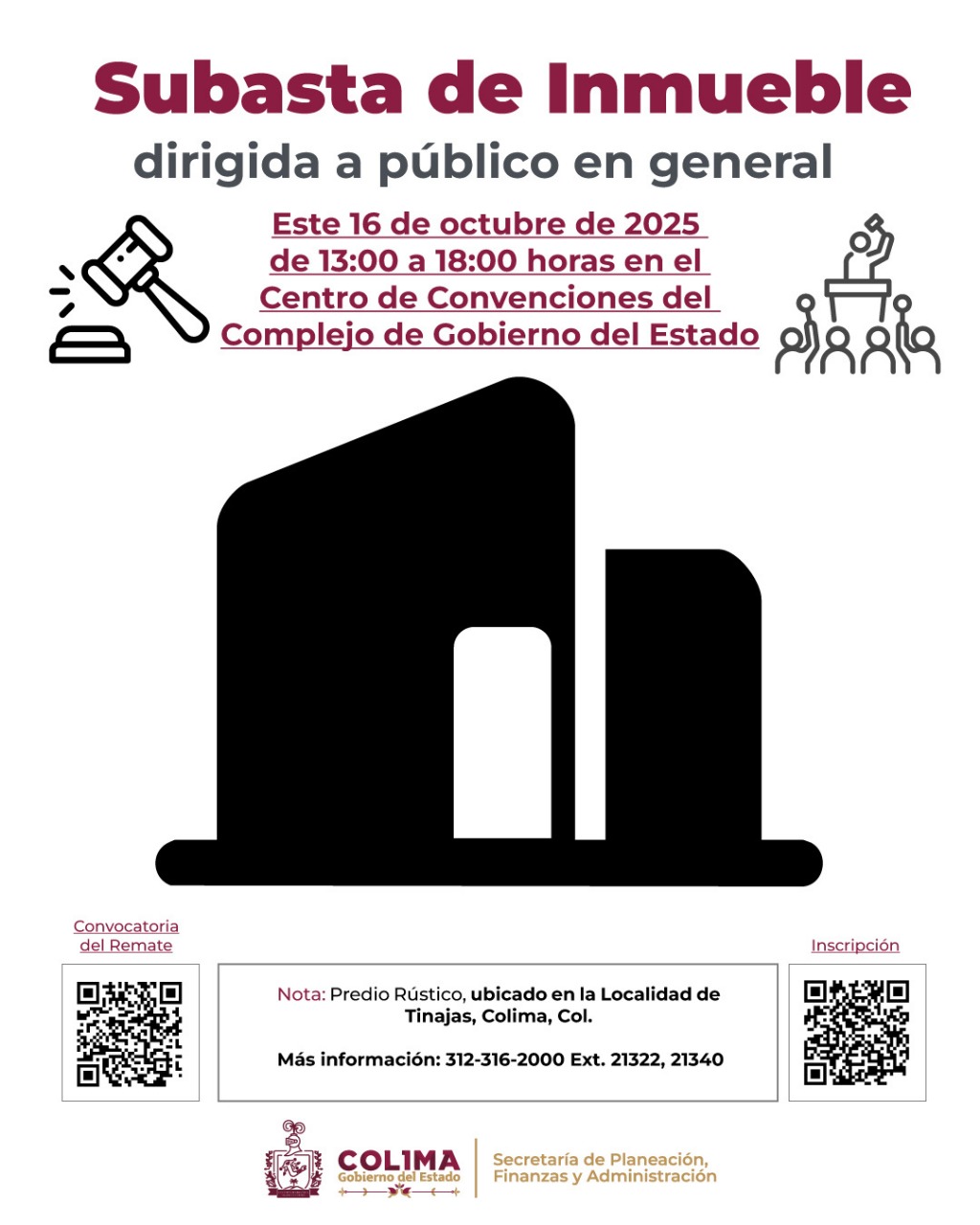 La Secretaria de Planeación, Finanzas y Administración (Seplafina) del Gobierno del Estado de Colima, informa que rematará un predio rústico ubicado en la localidad de Tinajas, municipio de Colima, correspondiente a la fracción 3 del predio rústico denominado El Rincón Largo, con una superficie de 39 hectáreas; el remate será el jueves 16 de octubre de 13:00 a 18:00 horas, en el Centro de Convenciones del Complejo Administrativo, en esta capital.