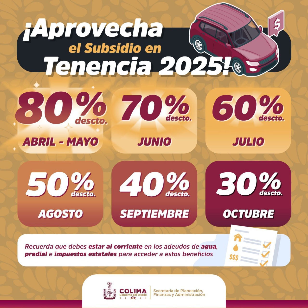 También hay beneficios graduales en el subsidio en Tenencia 2025, de la siguiente manera: 80% de descuento de abril a mayo, 70% en junio, 60% en julio, 50% en agosto, 40% en septiembre y 30% de descuento en octubre.
