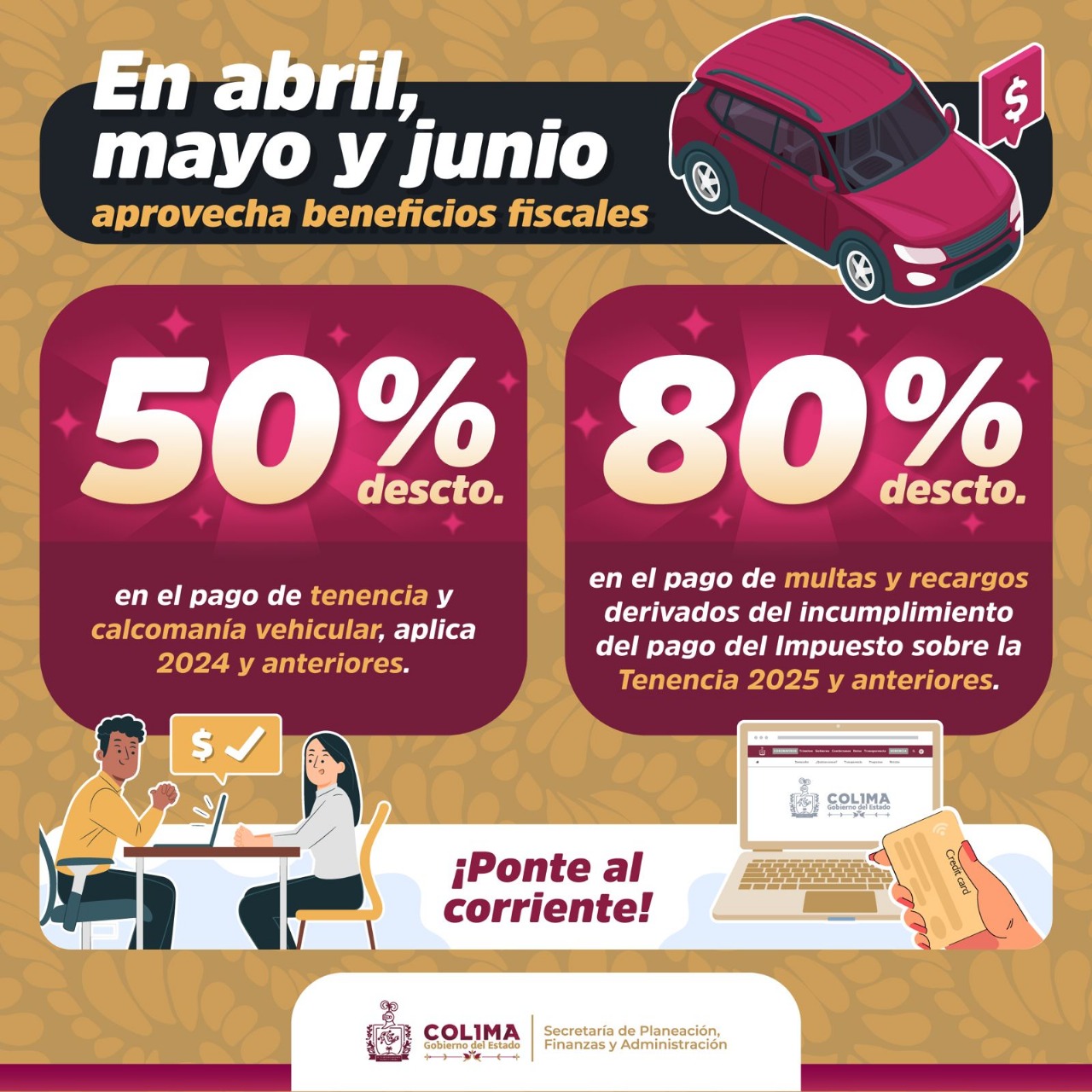 La Secretaría de Planeación, Finanzas y Administración (Seplafina) del Gobierno del Estado de Colima hace un llamado a ciudadanas y ciudadanos colimenses, para aprovechar los beneficios fiscales temporales que vencen el 30 de junio del presente año 2025, que son los siguientes: