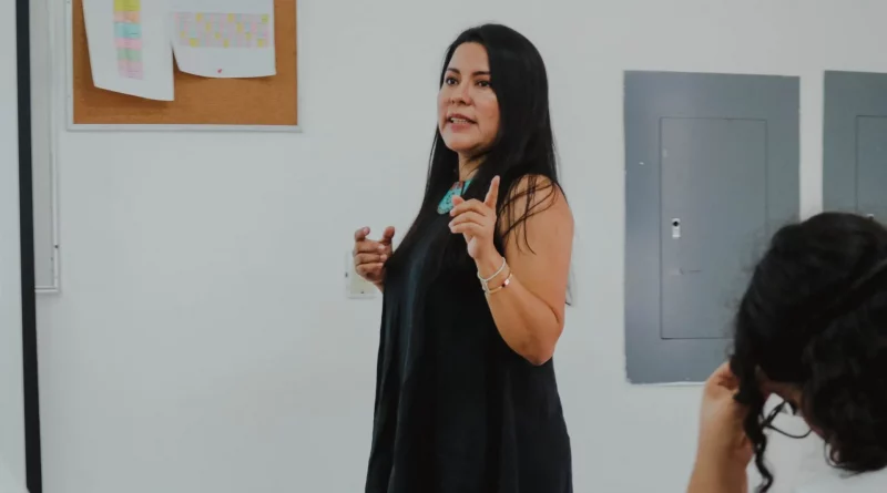 Durante su charla, realizó ejercicios con estudiantes apoyada en la corriente de las constelaciones familiares, para que las y los jóvenes tuvieran una idea del impacto de los conflictos internos y sus repercusiones a lo largo de la vida.