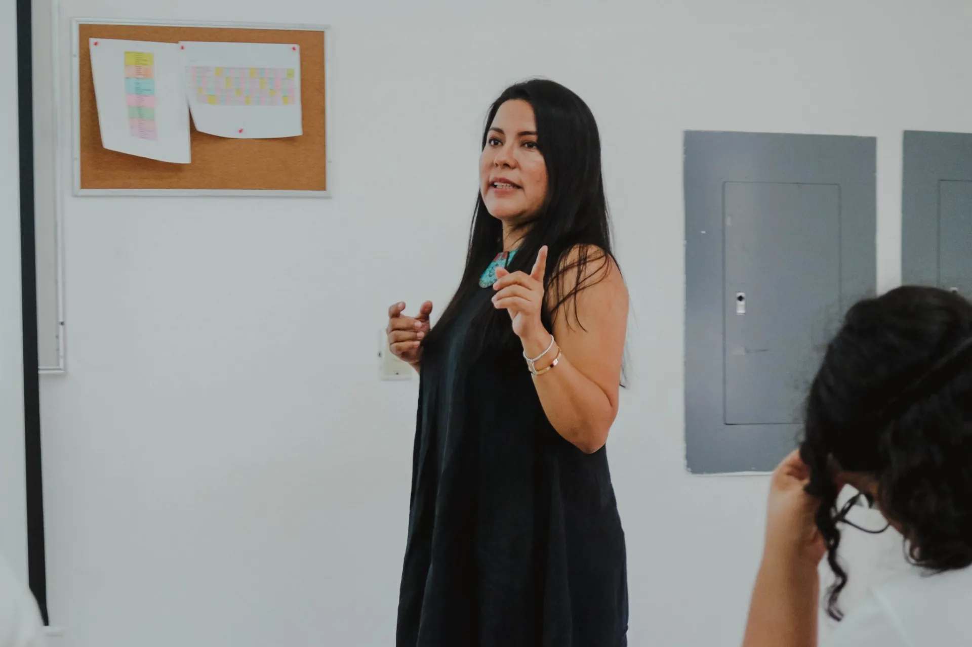 Durante su charla, realizó ejercicios con estudiantes apoyada en la corriente de las constelaciones familiares, para que las y los jóvenes tuvieran una idea del impacto de los conflictos internos y sus repercusiones a lo largo de la vida.