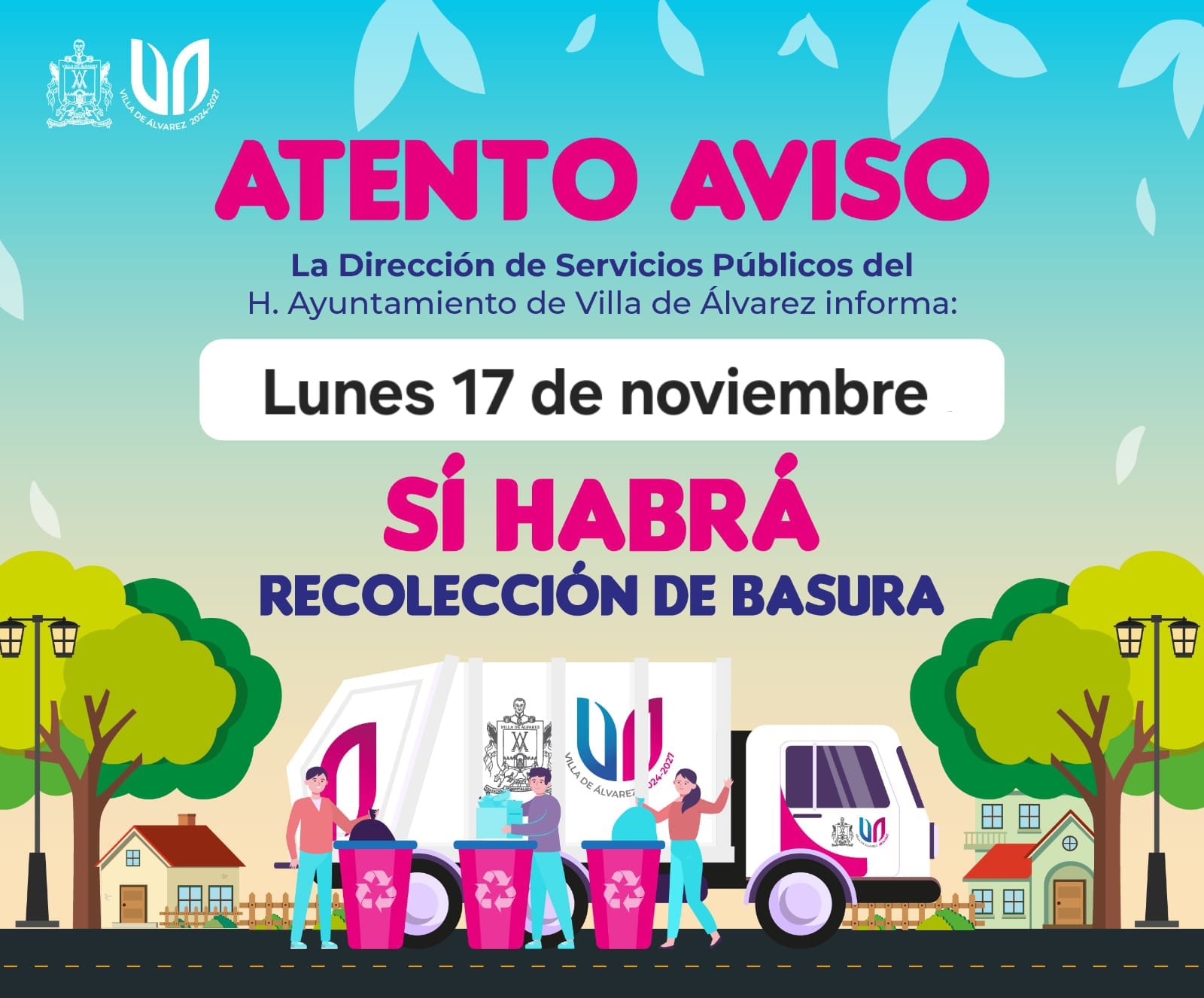 Villa de Álvarez, Col.- El Ayuntamiento de Villa de Álvarez, a través de la Dirección General de Servicios Públicos, informa que este lunes 17 de noviembre de 2025 la recolección de basura en las colonias y comunidades del municipio se realizará de manera normal.