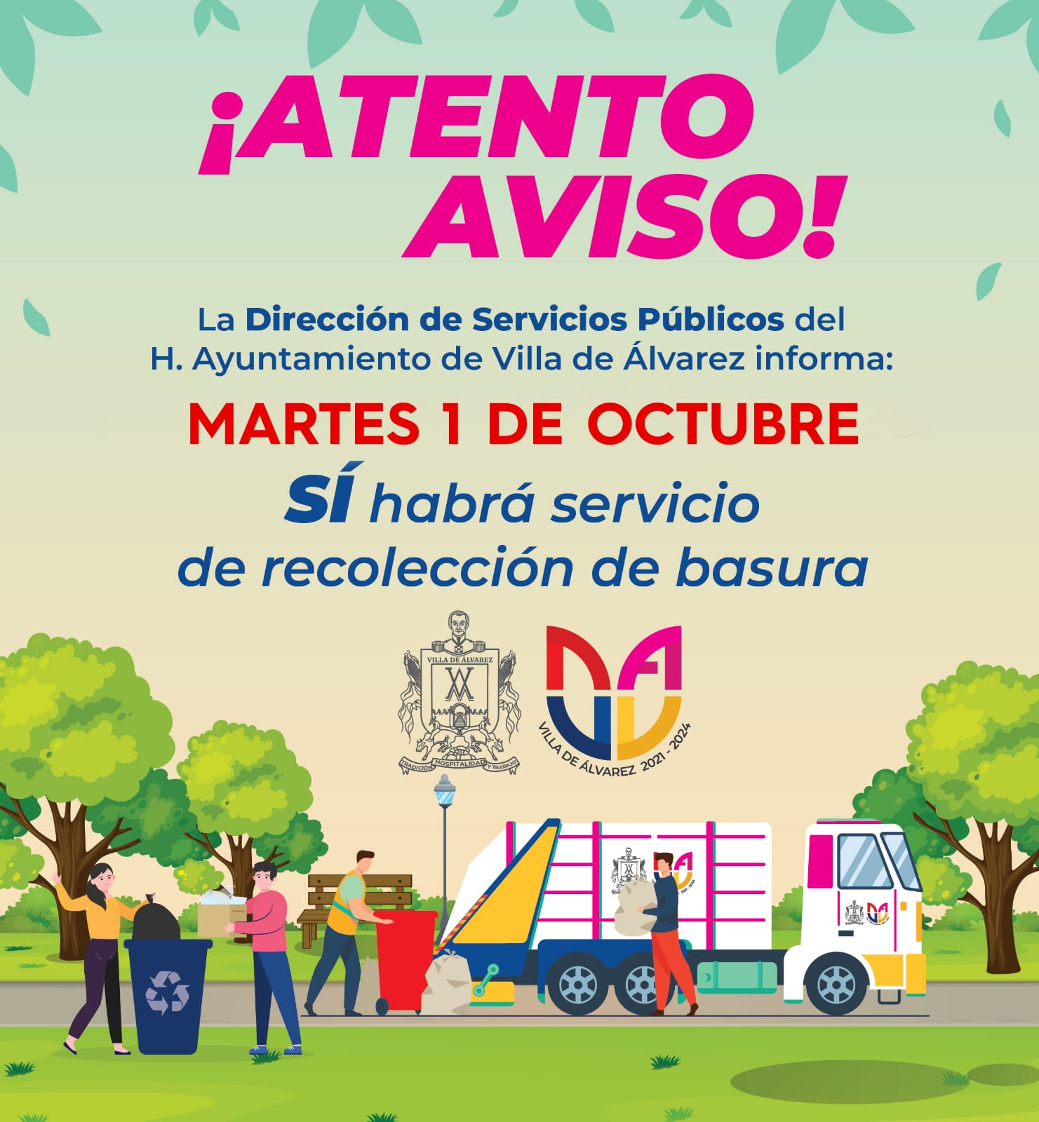 Villa de Álvarez, Col.- El Ayuntamiento de Villa de Álvarez, a través de la Dirección de Servicios Públicos Municipales, informa que este martes 1 de octubre de 2024 la recolección de basura en las colonias y comunidades del municipio se realizará de manera normal.