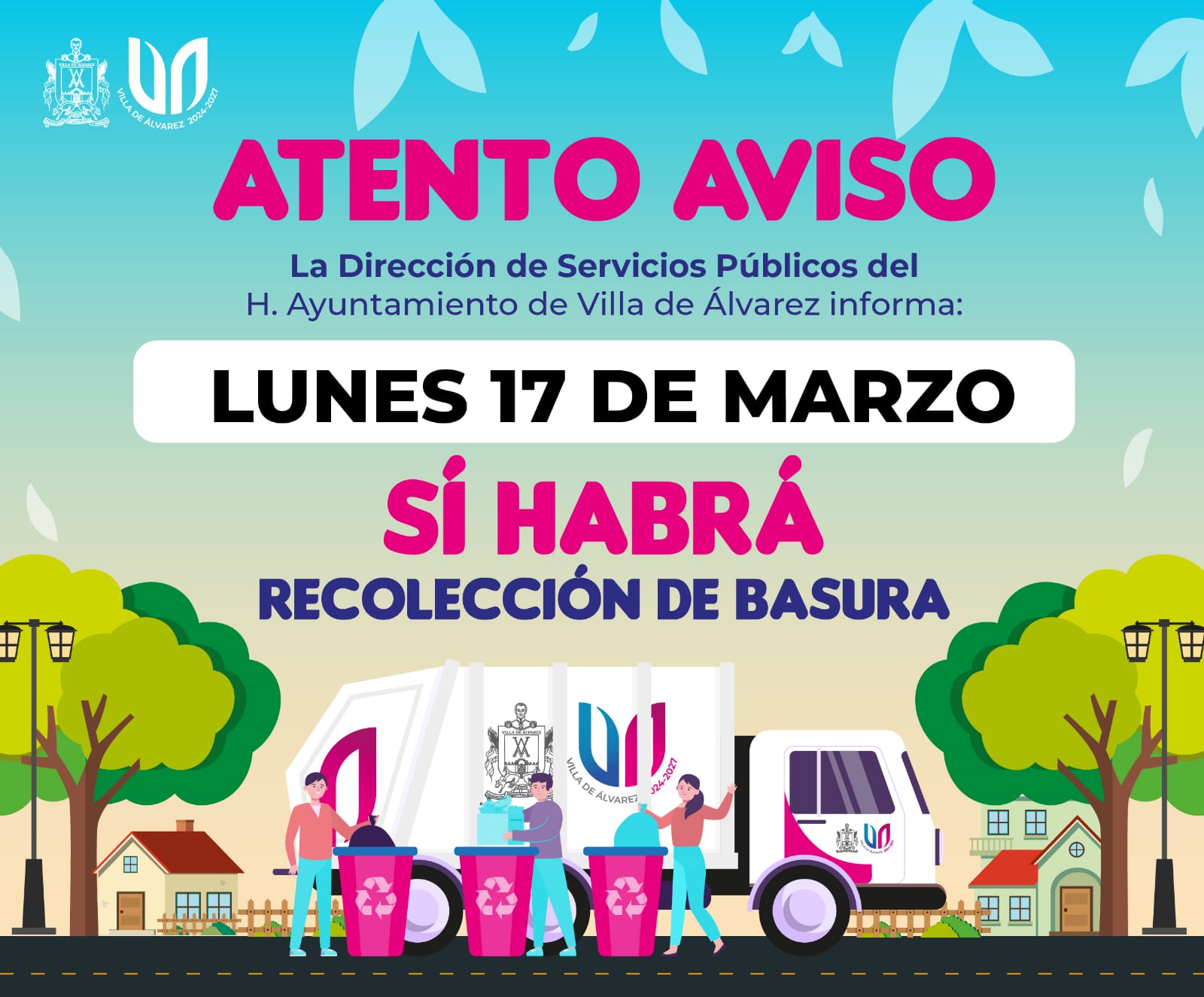 Villa de Álvarez, Col.- El Ayuntamiento de Villa de Álvarez, a través de la Dirección de Servicios Públicos, informa que este lunes 17 de marzo de 2025 la recolección de basura en las colonias y comunidades del municipio se realizará de manera normal.