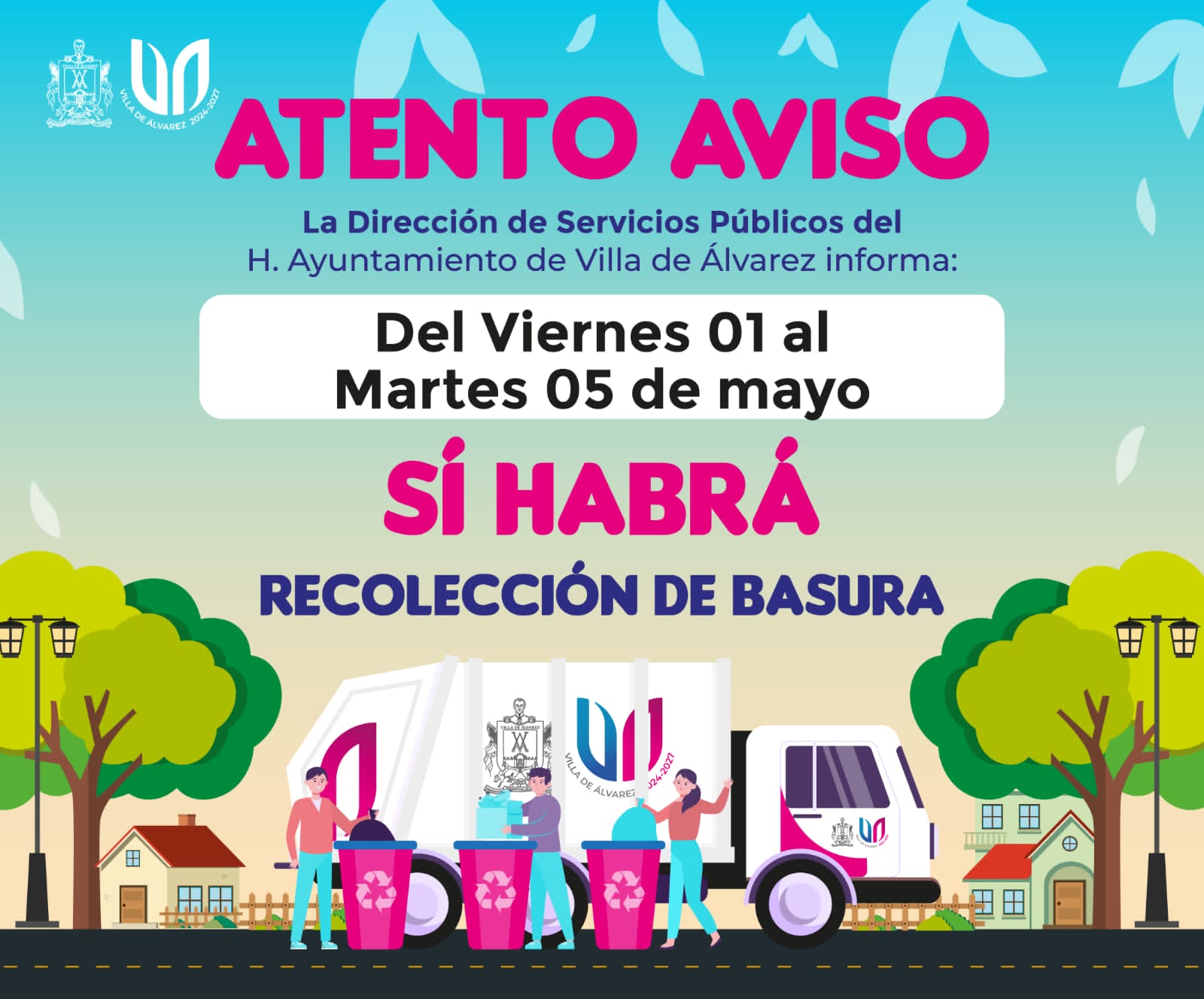 Villa de Álvarez, Col.- El Ayuntamiento de Villa de Álvarez, a través de la Dirección de Servicios Públicos, informa a la población que los días viernes 1, sábado 2, domingo 3, lunes 4 y martes 5 de mayo, la recolección de basura en las colonias y comunidades del municipio se realizará de manera normal.