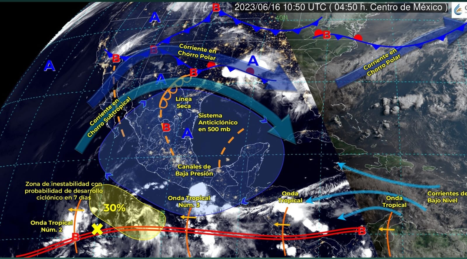 Conagua, fuente oficial del Gobierno de México, vigila de manera permanente una zona de inestabilidad en el Pacífico centro, que mantiene 30 por ciento de probabilidad para desarrollo ciclónico en los próximo siete días; se localiza al sur de las costas de Colima y Jalisco; se desplaza hacia el oeste-noroeste a 18 kilómetros por hora.