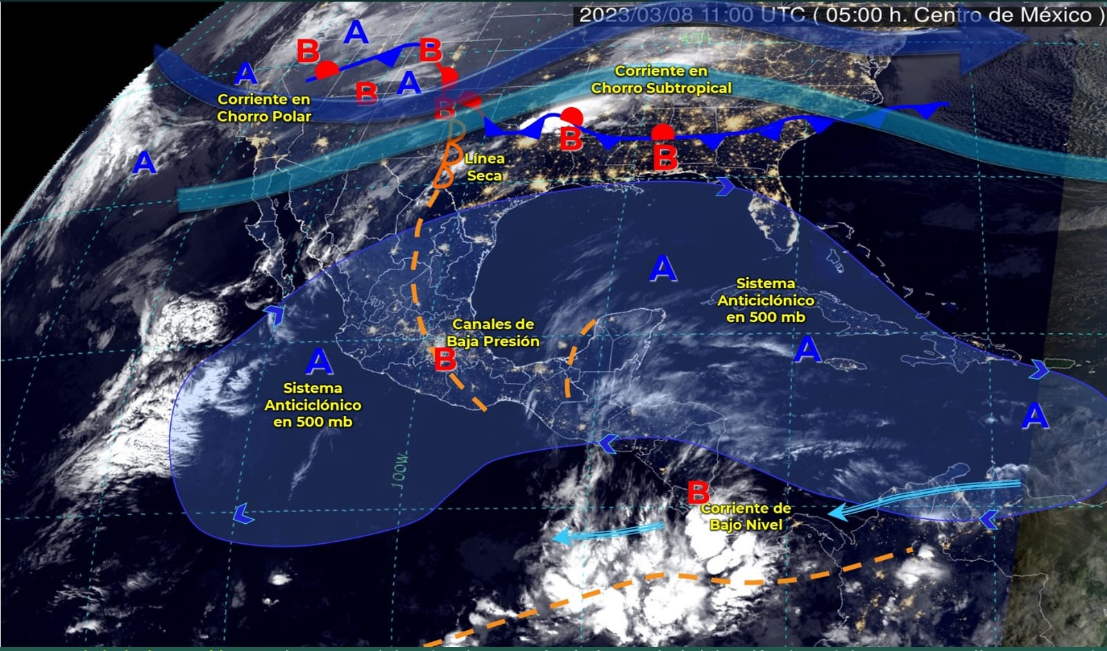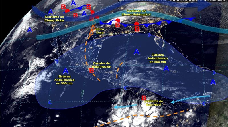 Para hoy se esperan temperaturas máximas de 35 a 40°C en: Colima, Jalisco, Nuevo León, Tamaulipas, San Luis Potosí, Hidalgo, Zacatecas, Nayarit, Oaxaca, Chiapas, Veracruz, Tabasco, Campeche, Yucatán; en contraste las temperaturas mínimas descenderían de -10 a -5°C con heladas en zonas montañosas de Chihuahua, Durango; de -5 a 0°C en Baja California, Zacatecas, Estado de México, Puebla y Veracruz.