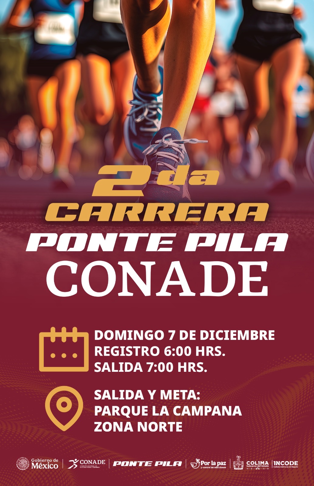 La segunda carrera ‘Ponte Pila’ sigue en pie para desarrollarse este domingo 7 de diciembre a partir de las 7:00 de la mañana en el Parque Ecológico ‘La Campana’ en la zona conurbada de Colima y Villa de Álvarez, iniciando con el registro gratuito a las 6:00 de la mañana, confirmó el director general del Instituto Colimense del Deporte (Incode), Alejandro Rodríguez Alvarado.
