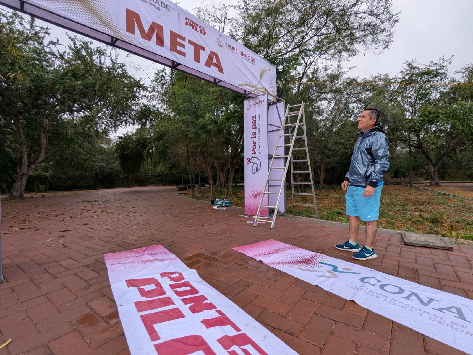 Este sábado, el titular del Incode supervisó la instalación de la sede de esta carrera en ‘La Campana’ y manifestó que a pesar de las condiciones climáticas registradas en la zona conurbada Colima-Villa de Álvarez debido al frente frío No. 18, la carrera continúa vigente para arrancar la mañana de este domingo.